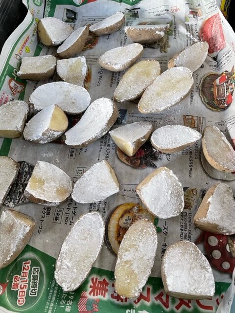 種いもは半分に切り、2〜3日乾かしてから石灰をつけました