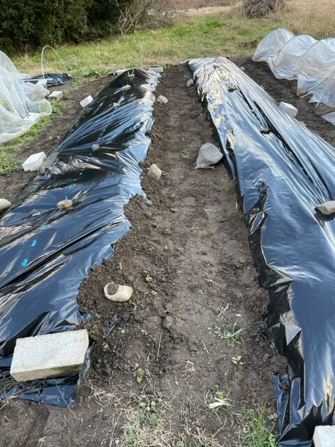 芽がでてきたら、マルチに穴を開けて芽を外へ出します